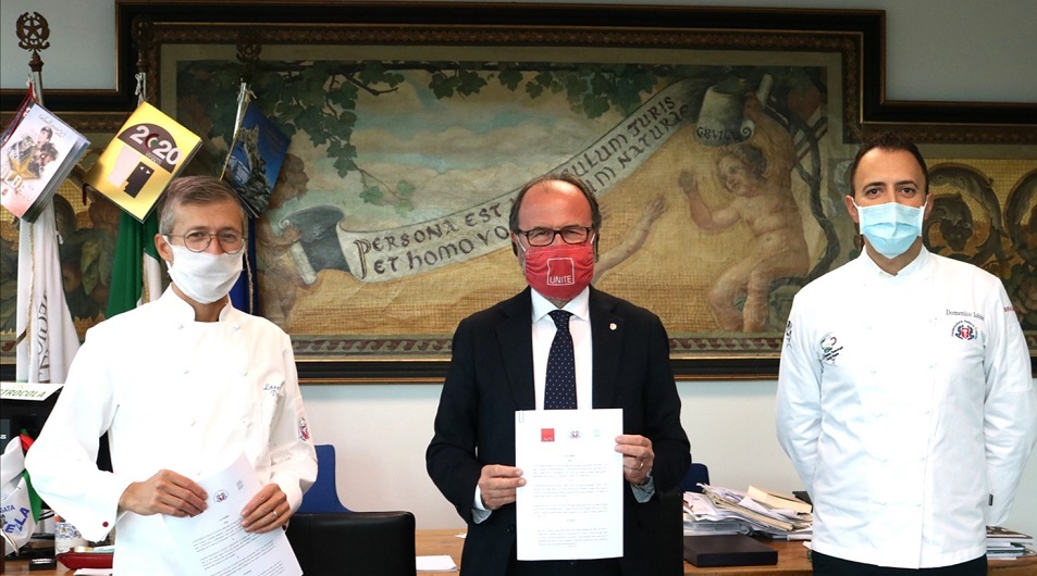 L’Unione Regionale Cuochi Abruzzesi e la Federazione Italiana Cuochi hanno sottoscritto un accordo con l’Università degli Studi di Teramo per incentivare la formazione culturale dei cuochi attraverso l’iscrizione al corso di laurea in “Scienze e Culture gastronomiche per la sostenibilità”. (nella foto di copertina: Lorenzo Pace, Dino Mastrocola e Domenico Iobbi)