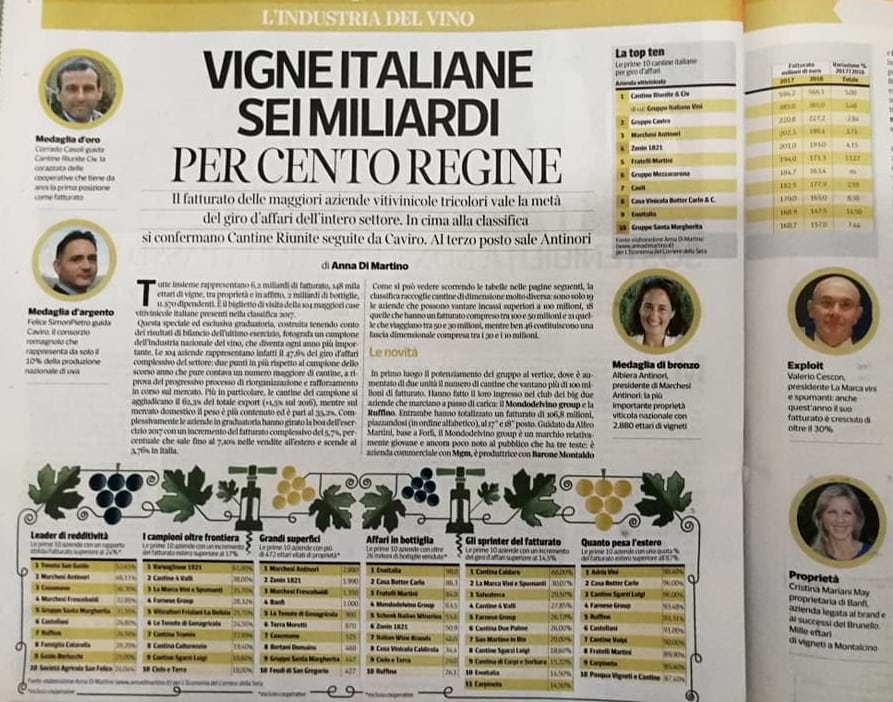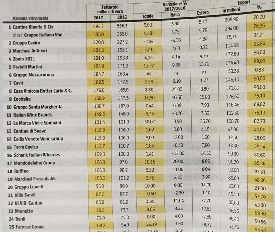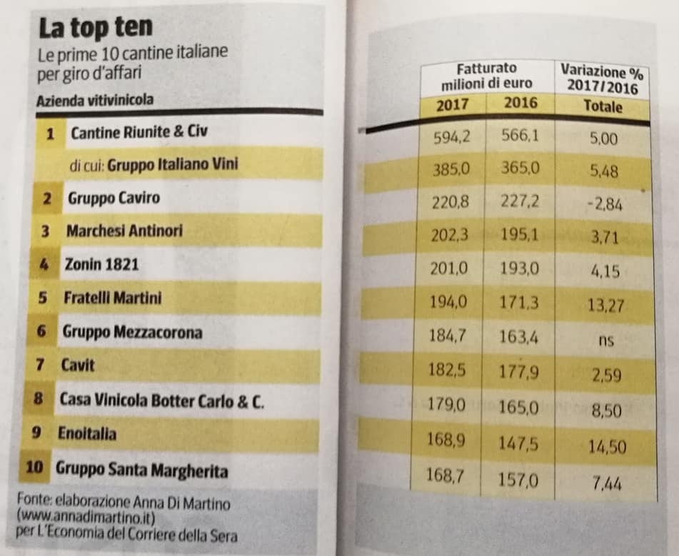La sempre brava Anna di Martino continua a pubblicare ogni anno, come ha sempre fatto sul settimanele il Mondo, il fatturato delle maggiori aziende vitivinicole tricolori che vale la metà del giro d’affari dell’intero settore.