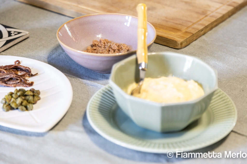 Passiamo alla salsa: tritiamo capperi, acciughe e tonno, per poi unire tutto alla maionese. Se lo si desidera si possono aggiungere due uova sode e due cucchiai del brodo della carne.