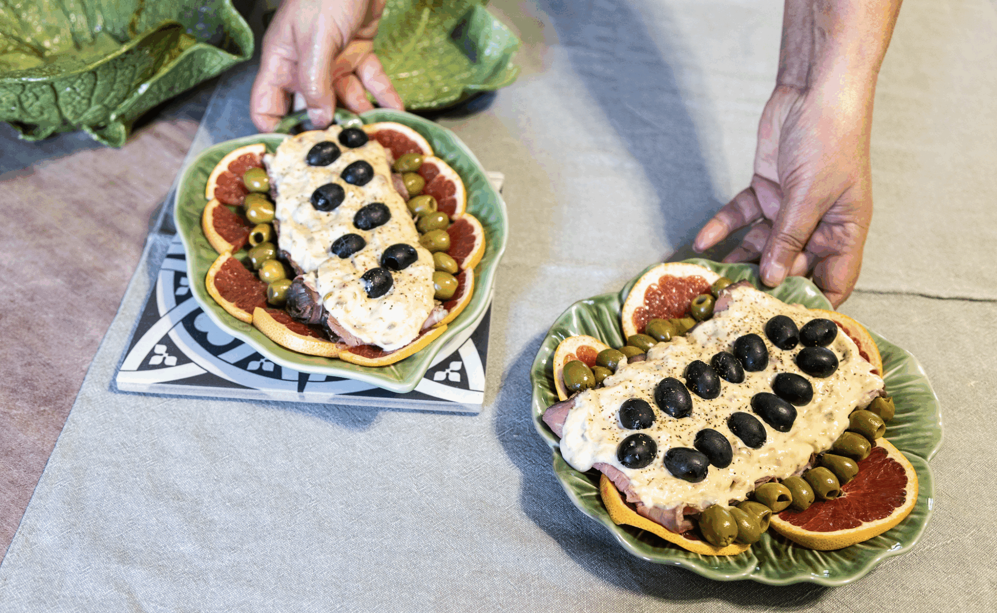 Una volta pronte carne e salsa non ci resta che impiattare! Noi, come dicevo, abbiamo inserito delle fettine di pompelmo rosa alla base: non solo belle, ma anche perfette per dare un tocco di leggerezza in questa calda estate. Infine, qualche oliva verde e nera come decorazione, ma ci si può davvero sbizzarrire in tanti modi, per esempio aggiungendo uova sode, carote o fiori edibili!