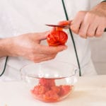 Per preparare la pasta all'amatriciana, sbollenta in acqua salata i pomodori per 90 secondi